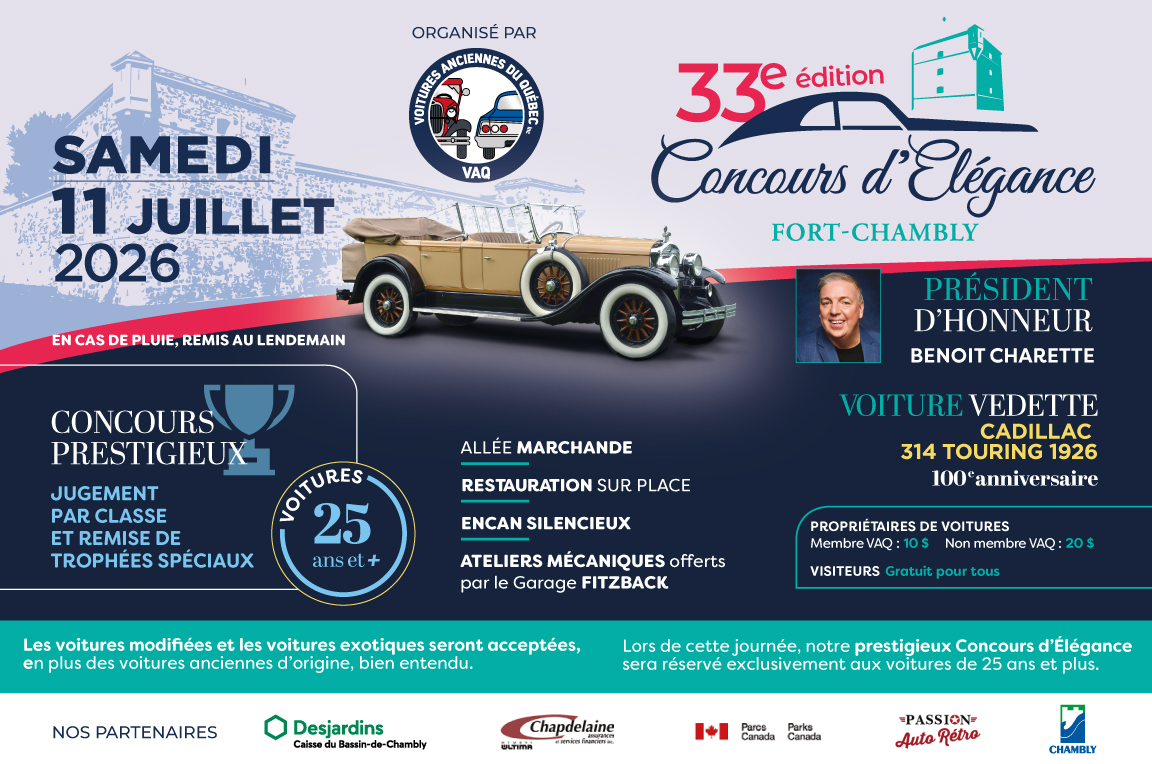 Le VAQ accueillera donc toutes les voitures de 25 ans et plus sur le terrain du Fort Chambly. Remise de trophées selon les formules jugement (critères stricts) et coup de coeur.